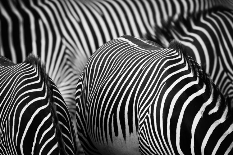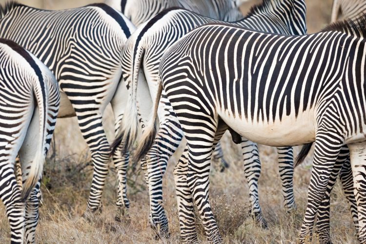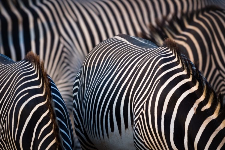 A ‘classic’ zebra image I hoped to create was an abstract photo composed to show only the stripes of a few zebras close together while eliminating other features. To do this we drove late in the evening to nearby Samburu National Reserve where we knew the animals would be more comfortable with us viewing them in a ‘safari’ setting. We found a large herd that allowed us to sit closely by and the light got better and better with the contrast improving markedly as sunset approached.