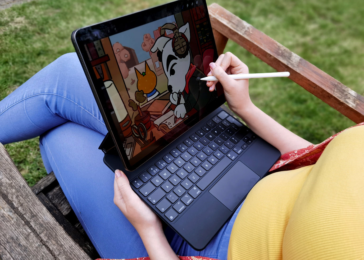 Drawing is possible using the iPad Pro in ‘laptop mode’, where you’re using it almost like an easel. However, your arms and wrists would have to happy with the screen being at a near-to-vertical angle – you can’t tilt it down to a drawing table-like lower angle than many artists would find more comfortable for drawing.