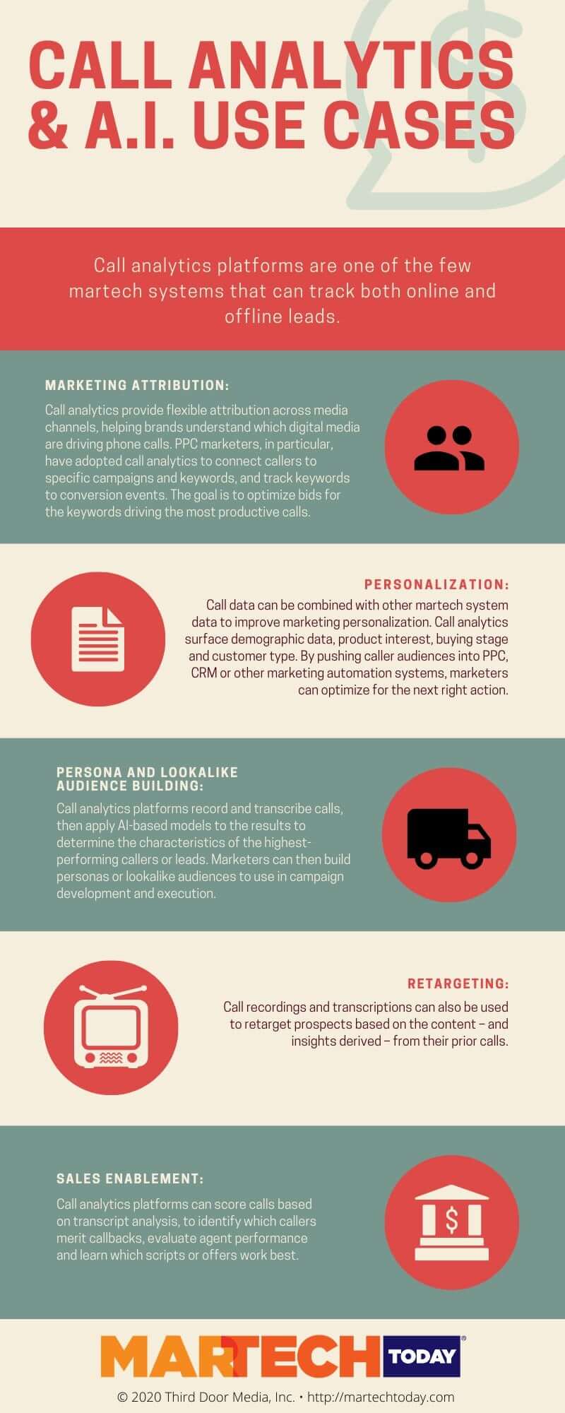 Call tracking – following a call from source (e.g. website, click-to-call search or display ad) to sales representative (e.g. based on geographic location or product line) – has been a core use case. However, call analytics platforms now work for a number of marketing use cases: