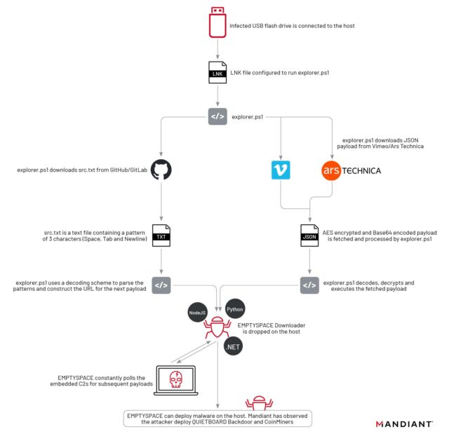 The initial stage of the malware was transmitted by infected USB drives. The drives installed a payload Mandiant has dubbed explorerps1. Infected devices then automatically reached out to either the malicious text file or else to the URL posted on Ars or the video posted to Vimeo. The base 64 strings in the image URL or video description, in turn, caused the malware to contact a site hosting the second stage. The second stage of the malware, tracked as Emptyspace, continuously polled a command-and-control server that, when instructed, would download and execute a third stage.