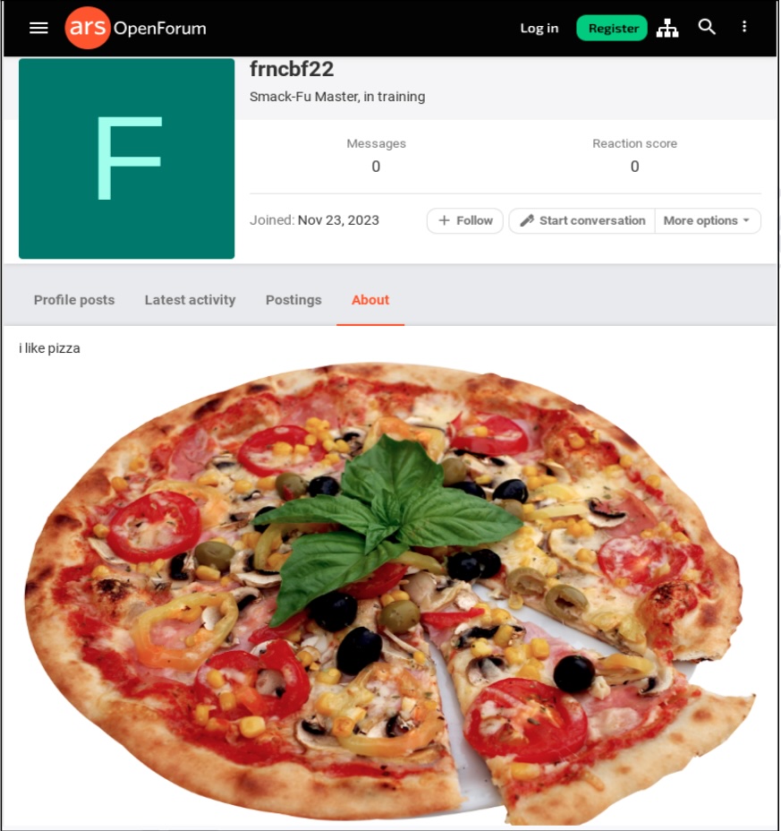 The image posted on Ars appeared in the about profile of a user who created an account on November 23. An Ars representative said the photo, showing a pizza and captioned “I love pizza,” was removed by Ars staff on December 16 after being tipped off by email from an unknown party. The Ars profile used an embedded URL that pointed to the image, which was automatically populated into the about page. The malicious base 64 encoding appeared immediately following the legitimate part of the URL. The string didn’t generate any errors or prevent the page from loading.