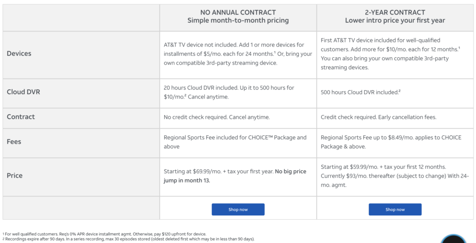 Previously, AT&T TV was only available with a contract. There is now a no-contract option that costs more in the first year but could be cheaper in the long run if customers use it for multiple years.