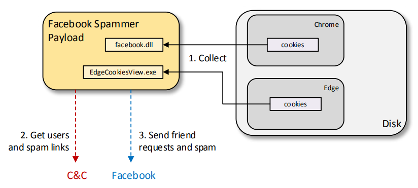 Il primo componente installato è il dropper, che si preoccupa per prima cosa di rubare alcune informazioni come cookie, credenziali di login e pagamento attraverso delle DLL specializzate che prendono di mira in particolare Facebook, Amazon e Airbnb.