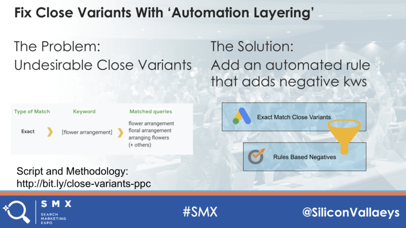 There are two specific ways I’ve shared to layer an automation on top of Google’s exact match keywords to keep control when they expand to close variants with similar meaning.