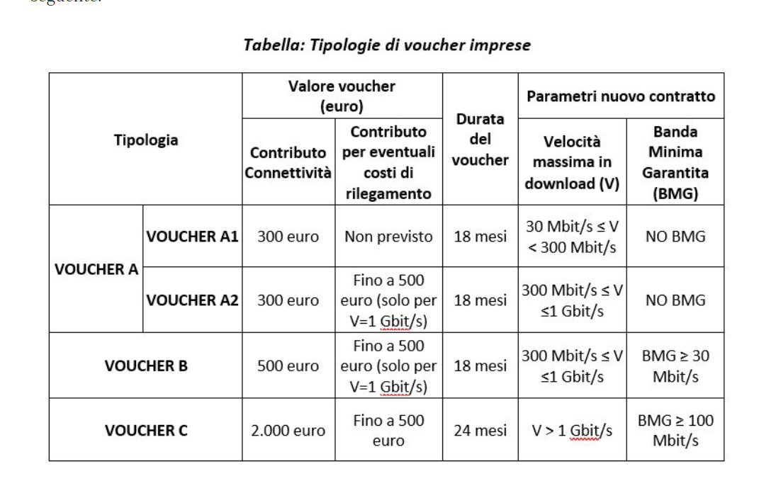 Il “Piano Voucher per le Imprese”, si legge in una nota, prevede l’erogazione di un contributo di importo compreso tra un minimo di 300 euro e un massimo di 2.000 euro – sulla base delle caratteristiche della connettività – per l’attivazione di contratti di connettività con velocità in download fino a 1 Gbit/s (e superiori),della durata da un minimo di 18 mesi a un massimo di 36 mesi; è previsto, inoltre, un ulteriore contributo di 500 euro per le sedi che hanno necessità di essere connesse con infrastrutture in fibra ottica FTTH. L’erogazione di un voucher connettività si applica in caso di richiesta di attivazione di nuovi servizi di connettività o in presenza di step change, inteso come incremento della velocità di connessione già attiva con Vodafone o con altro operatore.