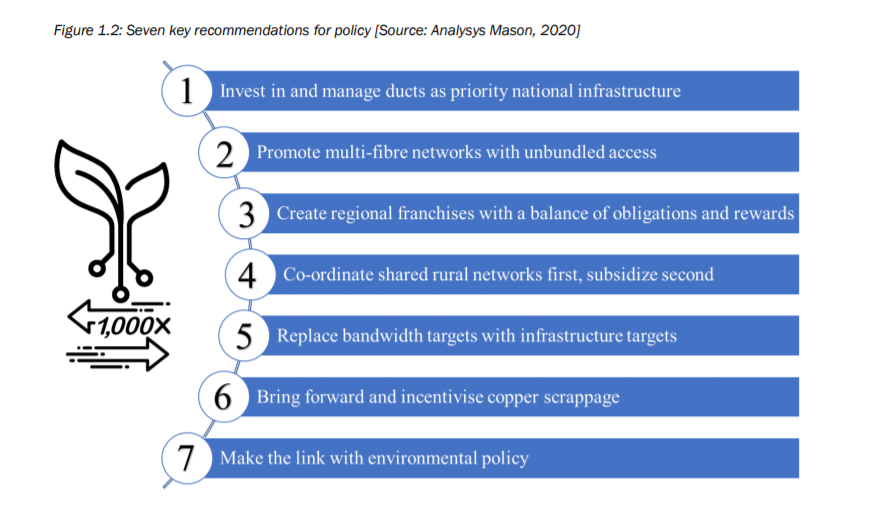 Le raccomandazioni del report sono chiare: per favorire lo sviluppo delle nuove reti bisogna investire e considerare le infrastrutture di rete come una priorità nazionale; bisogna favorire l’accesso disaggregato (unbundled) a reti multiple in fibra; favorire dei franchise regionali con sistemi premianti; coordinare la condivisone delle reti nelle aree rurali; pensare ai target infrastrutturali; incentivare la rottamazione del rame; creare un collegamento con le policy ambientali.