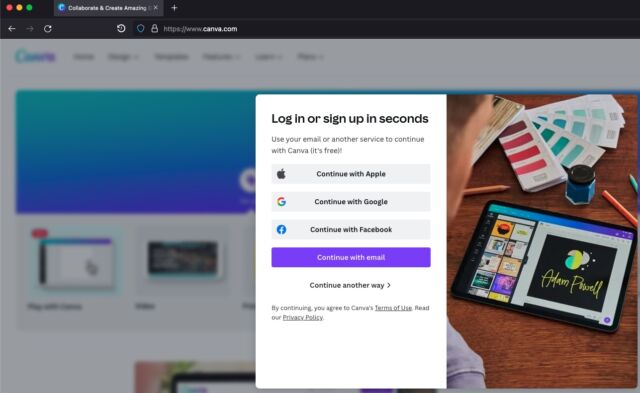 A researcher using the handle mr.d0x described the technique last week. His proof-of-concept exploit starts with a Web page showing a painstakingly accurate spoofing of Canva. In the event a visitor chooses to login using Apple, Google, or Facebook, the fake Canva page opens a new page that embeds what looks like the familiar-looking OAuth page.