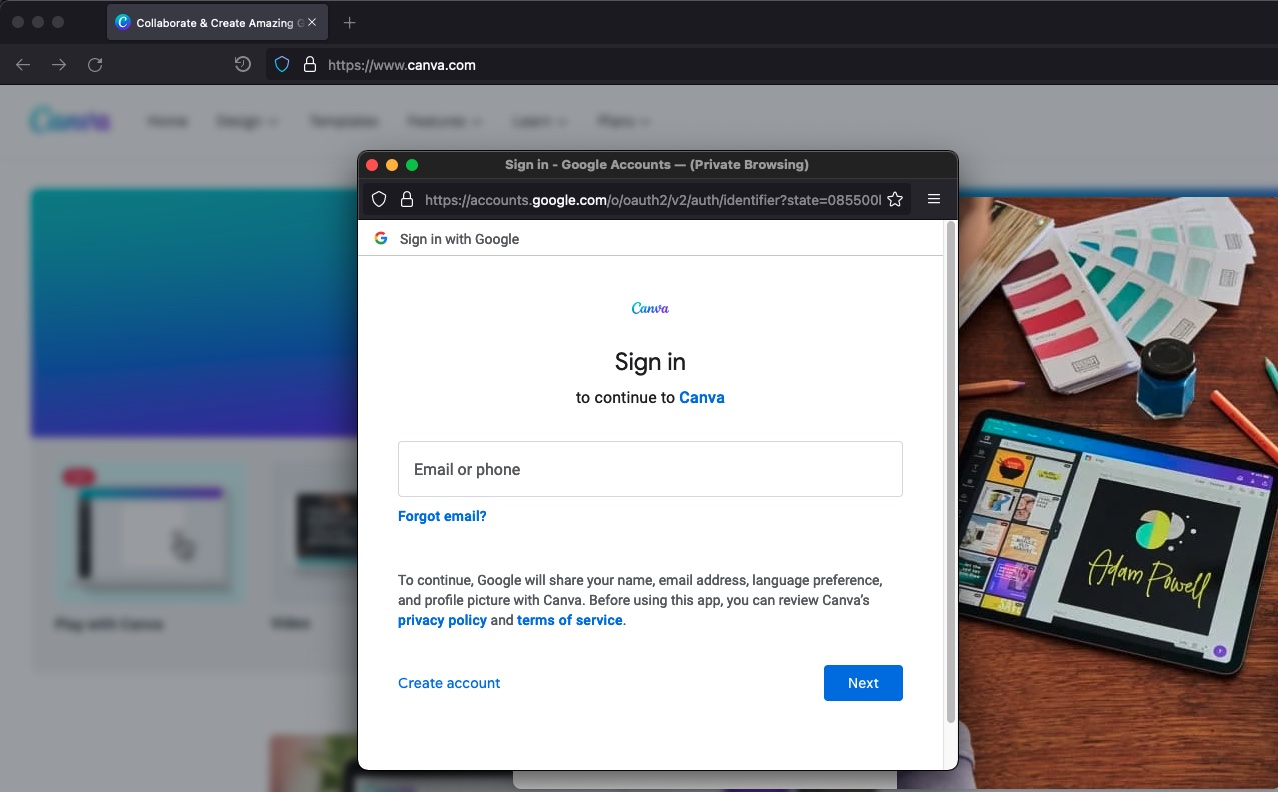 The photo editing site Canva, for instance, gives visitors the option to login using any of three common accounts. The images below show what a user sees after clicking the “sign in” button; following that, the image show what appears after choosing to sign in with a Google password. After the user chooses Google, a new browser window with a legitimate address opens in front of the existing Canva window.
