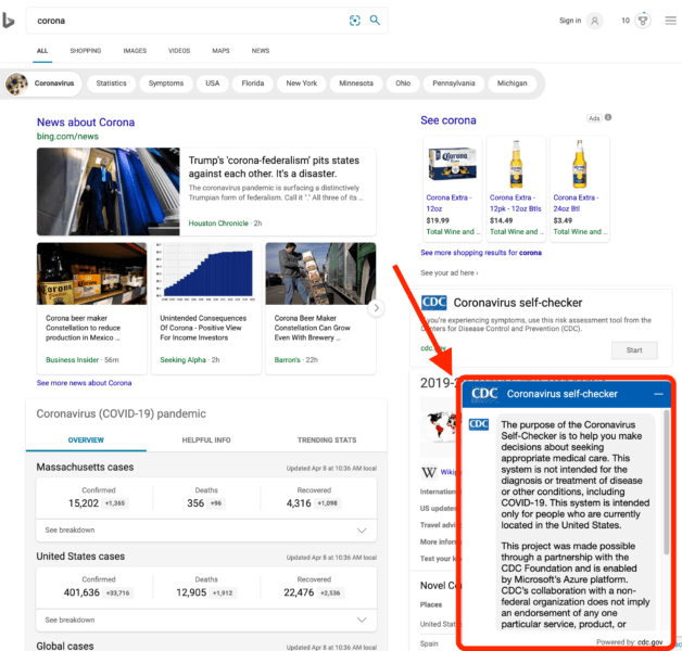 Bing’s “corona” and “coronavirus”-related search results pages now feature the Centers for Disease Control and Prevention’s (CDC) Coronavirus self-checker as a persistent, expandable chatbot.