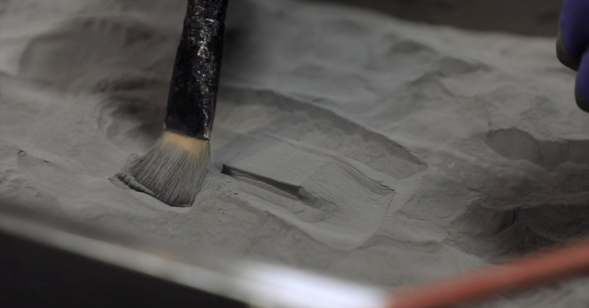 The hand holding the brush is attached to Amy Elliott, a research scientist at the Oak Ridge National Laboratory who specializes in 3D printing technology. The video starts after the printing itself is finished. Elliott uses a kind of 3D printing that involves squirting layer after layer of a glue-like binder into powdered metal, forming a tool or machine part that Elliott has to uncover eventually. That’s where the brushwork comes in. “I think that’s everybody’s favorite part. You get to put on your archaeologist outfit,” she says. “You just sweep the powder gingerly, and then you lift the part out — and the part is born.”
