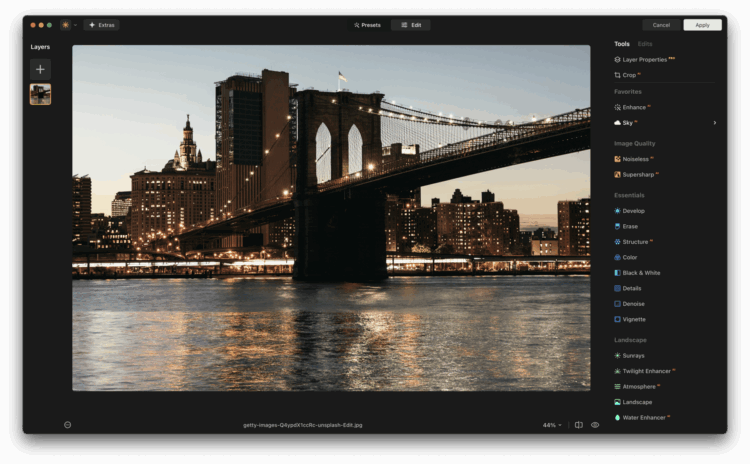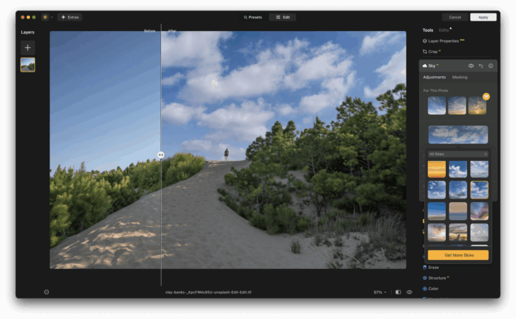 The new Volume tool adds a rich sense of depth by automatically enhancing light and shadow across the image. With one click, your photos get more drama, contrast, and atmosphere — no manual dodge and burn required.