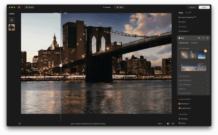 Sky AI automatically detects the sky in your image and allows you to replace it with one of your choosing. The plugin even adjusts lighting and reflections in the scene to match the new sky, creating believable results that would otherwise take hours to composite manually.