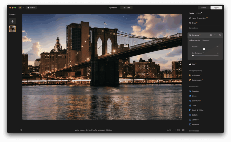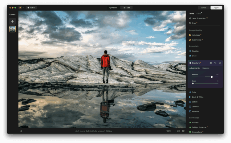 Structure AI adds intelligent detail and contrast without introducing unwanted noise or artifacts. Enhance AI gives you a one-slider improvement tool that adjusts contrast, clarity, color, and detail in a balanced way.
