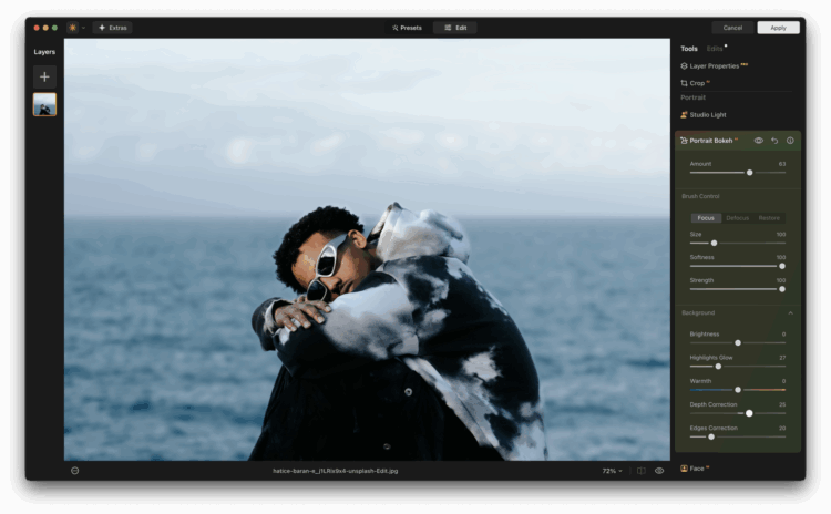 This tool uses depth mapping to simulate a shallow depth-of-field effect, perfect for portraits shot in distracting environments. You can blur the background and control the strength, edge transitions, and even the focus point with surgical precision.