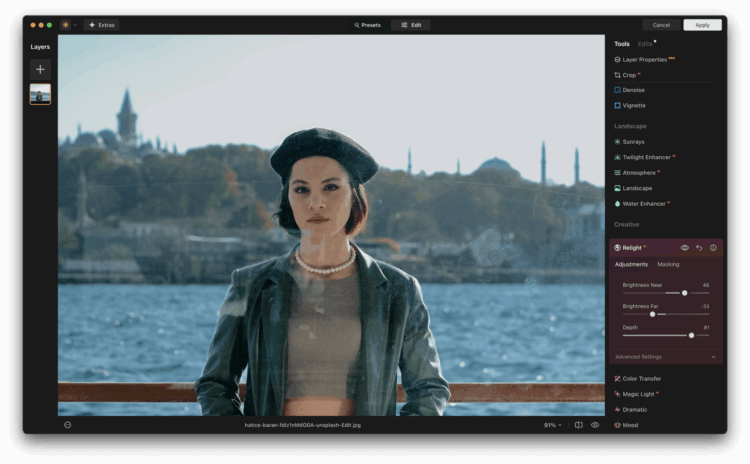 Perhaps one of the most game-changing features, Relight AI separates your image into foreground and background lighting zones. You can fix underexposed subjects or creatively relight scenes to match mood and atmosphere.
