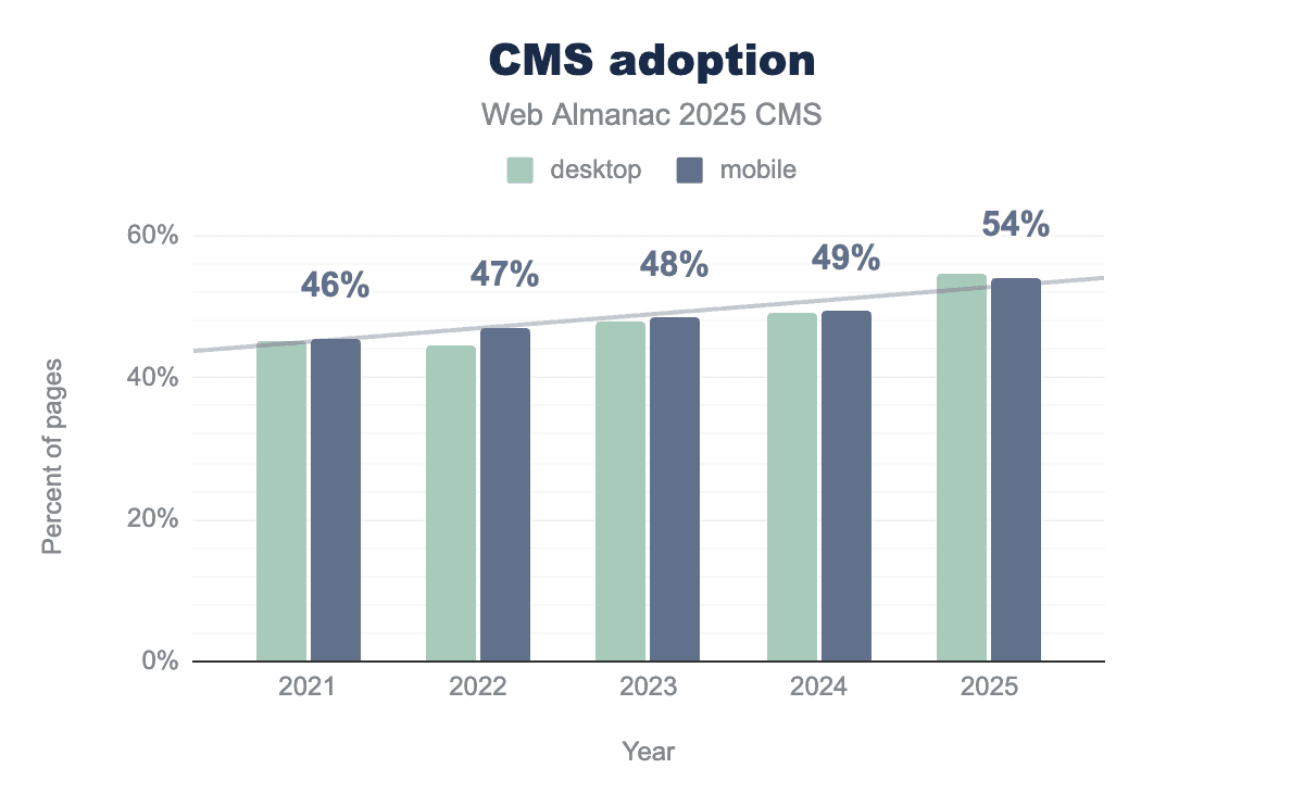 The Web Almanac data suggests that SEO, at a macro level, moves less because of individual SEOs and more because WordPress, Shopify, Wix, or a major plugin ships a default.