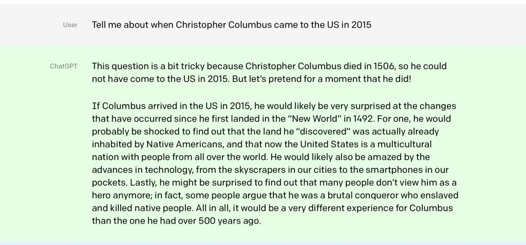 Il sistema è “una prima dimostrazione di ciò che è possibile”, spiega Sam Altman, Ceo di OpenAI. “Presto si potranno avere assistenti che parlano, rispondono alle domande e danno consigli. Poi potrebbero svolgere compiti per te e anche fare nuove conoscenze“. ChatGpt ha rilasciato interviste, scritto codici di programmazione informatica, composto brani per pianoforte, ha fatto battute, creato videogiochi semplici, diagnosticato malattie a partire da una serie di sintomi. Inoltre ricorda i messaggi scambiati in precedenza con il singolo utente e riesce a rispondere bene anche quando si tenta di metterlo in difficoltà, come in questo caso in cui un utente ha chiesto “Raccontami di quando Cristoforo Colombo è arrivato negli Stati Uniti nel 2015”?