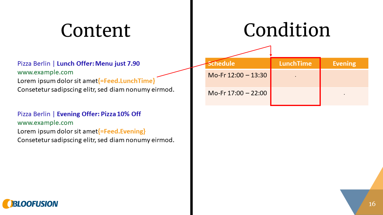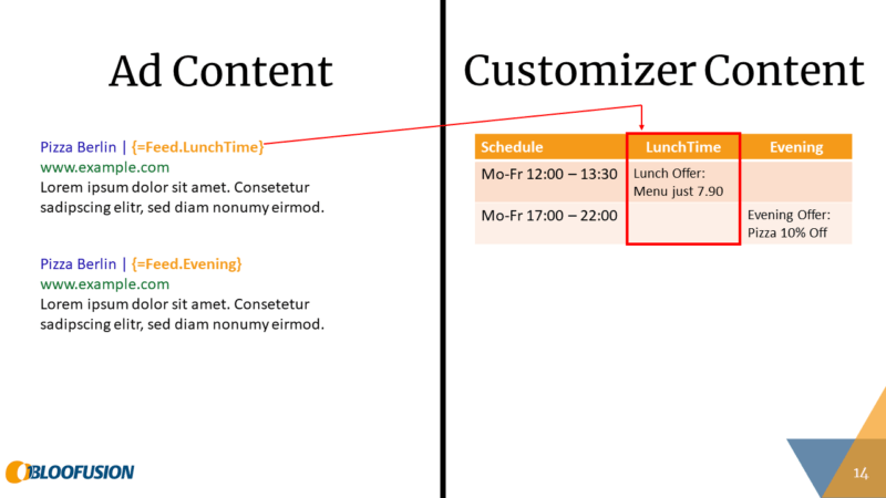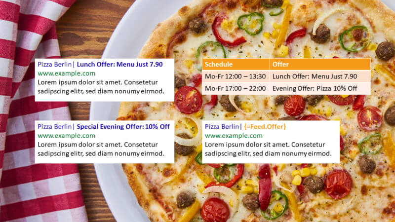 To demonstrate the approach, let’s look at a simple example. Let’s say a small pizza restaurant wants to promote their lunch offer during lunchtime and their evening offer during the evening. The following slide shows how their ads might look like (on the left) and how we would normally implement this using ad customizers (on the right):