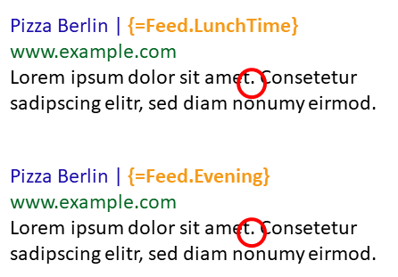 In this solution, two dedicated ads are used along with two dedicated columns in a data feed. The first ad refers to the “LunchTime” column, which only has content during lunchtime. Outside of lunchtime (noon – 1:30 p.m. in this case), there is no content for the first ad. Since the ad cannot be shown if there is no content, it cannot be shown outside of lunchtime. The same is true for the second ad with respect to the evening hours.