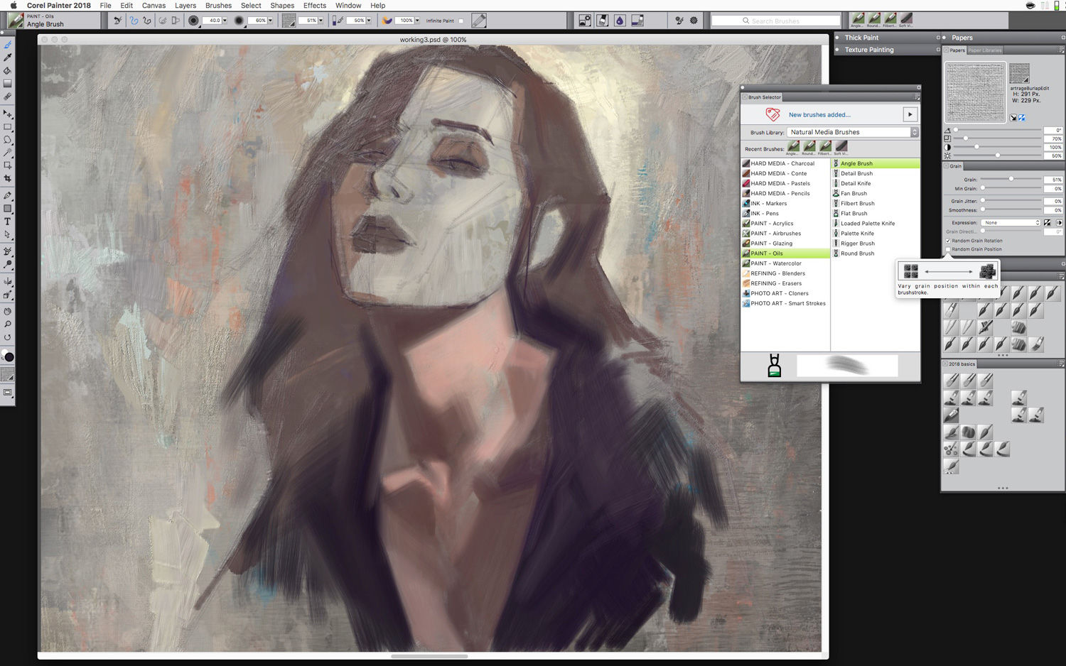 Painter 2018 has Random Grain Rotation and Random Grain Position options. These allow the paper grain to change a little with each stroke, randomising your brush marks and further reducing a ‘digital’ feel. These new settings can be applied to any brush that has a grain setting – so even older brushes can take advantage of the enhancement.