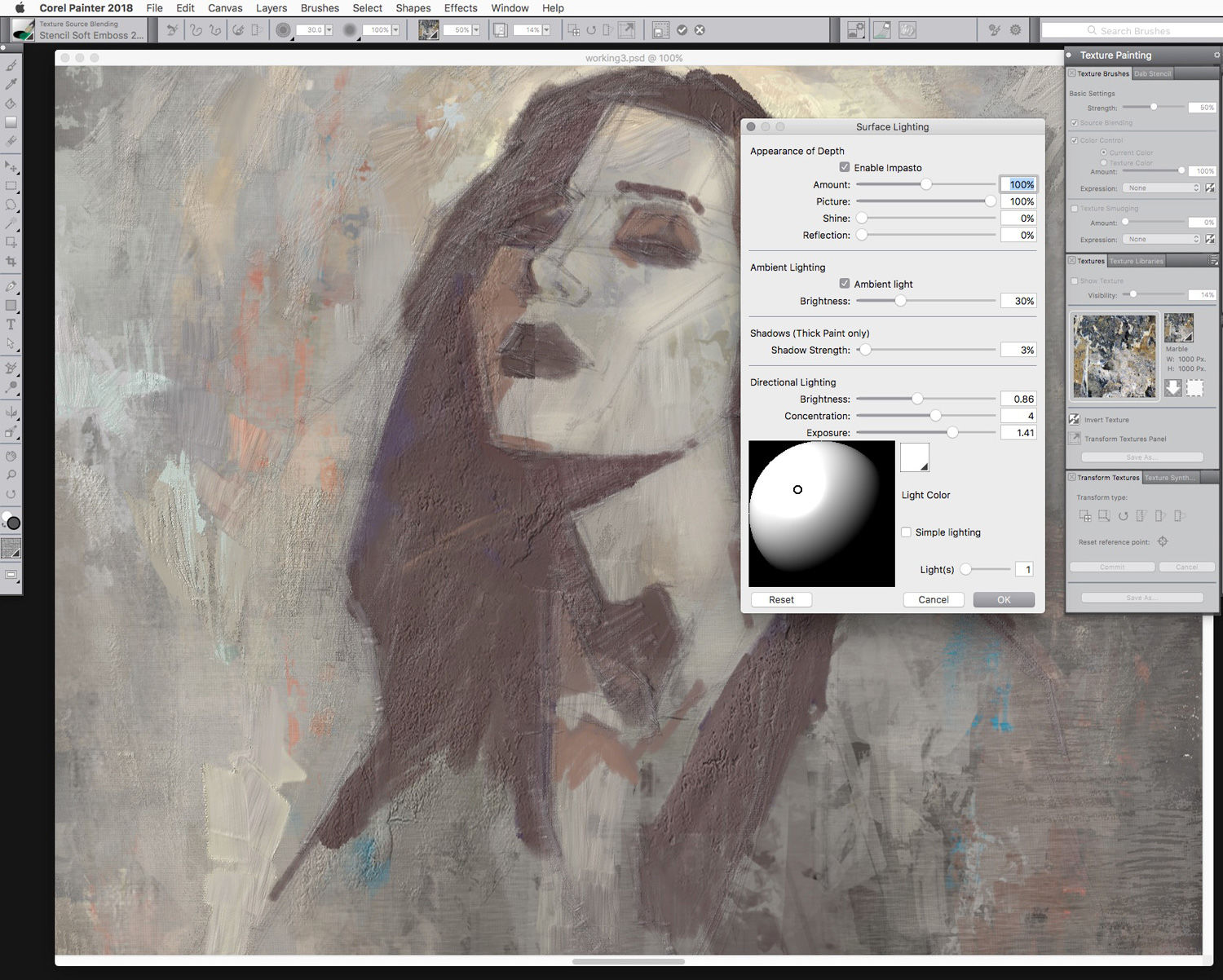 Added in Painter 2017, the Texture Painting brushes allow you to add texture directly to the painting and can be manipulated with a range of transform tools. Painter 2018 adds a new range of brushes to this feature called Thick Texture brushes.