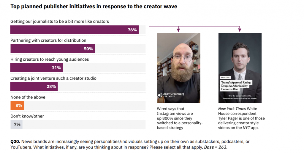 Il report insiste anche sul tema creator: per molti editori stanno sottraendo tempo e attenzione ai contenuti delle testate e, in una quota importante di casi, diventano anche un rischio sul fronte talenti. La reazione più diffusa è culturale: una larga maggioranza dice che proverà a far comportare le redazioni “più come creator”, lavorando su volto, voce, presenza nativa sulle piattaforme.