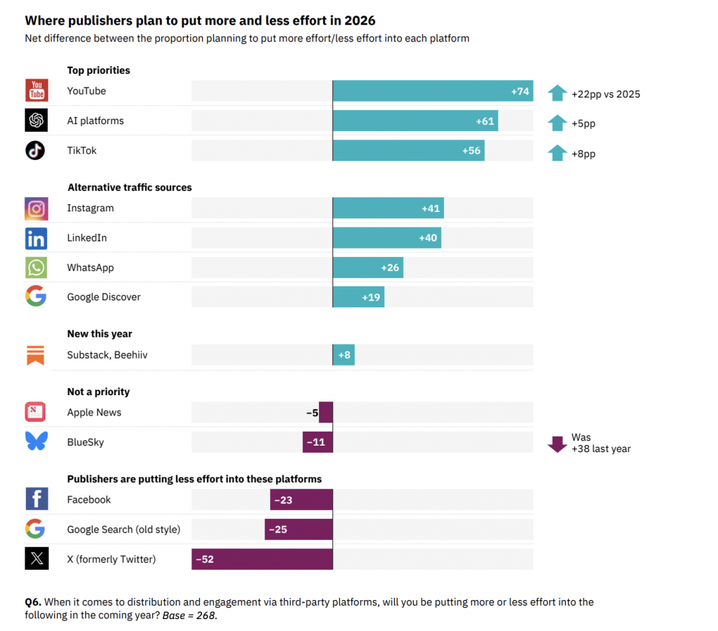 L’altra faglia è la distribuzione. Secondo il report, i publisher si aspettano che il traffico dai motori di ricerca scenda di oltre il 40% nei prossimi tre anni. La paura non è solo teorica: il passaggio verso interfacce che rispondono direttamente (anche in finestre conversazionali) riduce il valore del click e mette in discussione i modelli basati su referral e advertising. Il report ricorda anche che il declino delle piattaforme social come fonte di traffico è già un fatto: negli ultimi anni le visite in arrivo dai social sono calate pesantemente, con un impatto immediato sulla reach di molte testate.