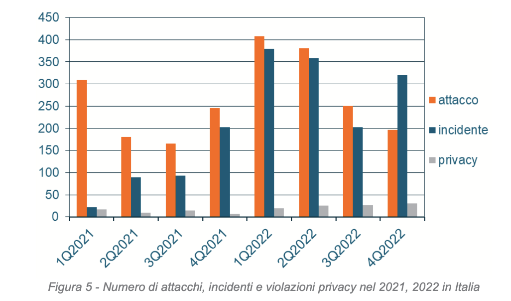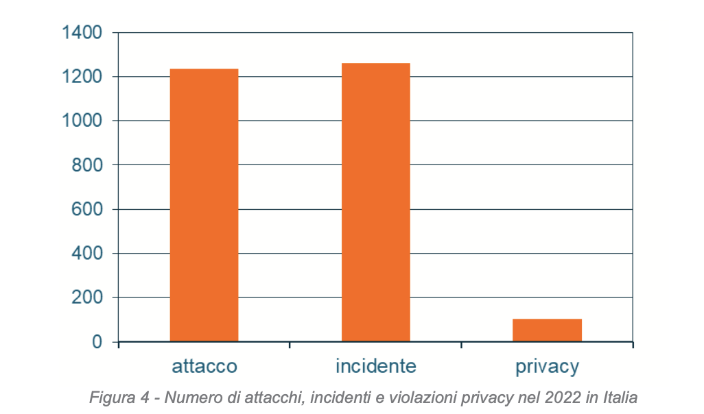 Nel 2022 in Italia sono stati registrati 2.600 fenomeni legati al cybercrime, di cui 1.236 attacchi, 1.261 incidenti e 103 violazioni della privacy; un numero quasi doppio rispetto ai 1.356 del 2021 e più che quadruplicato rispetto ai 605 del 2020.
