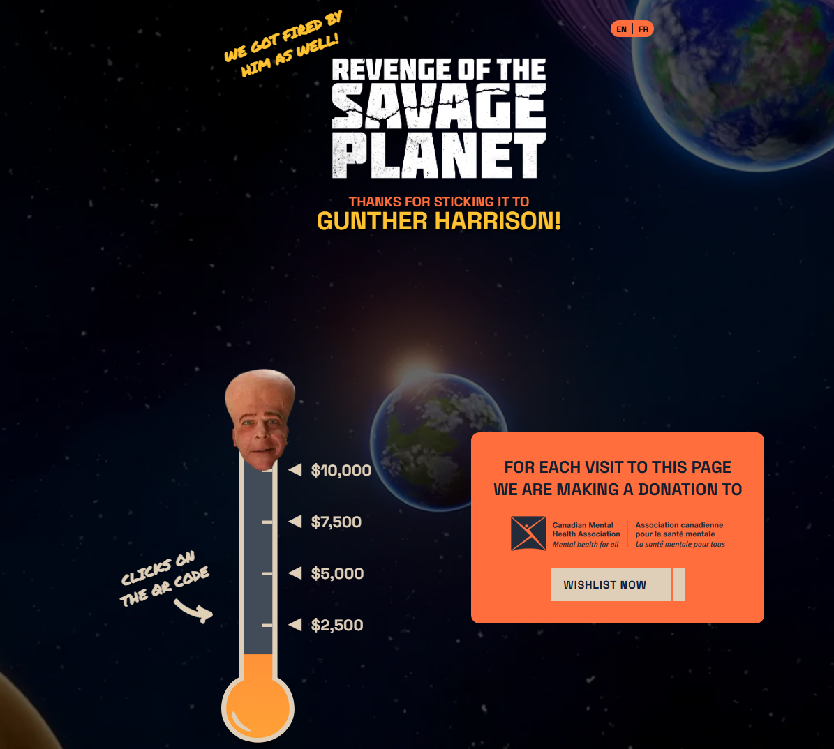 Raccoon Logic’s new San Francisco billboard includes a QR code that directs visitors to a promotional page for Revenge of the Savage Planet, featuring the pithy sympathy message that “We got fired by him as well!” The site promises a donation to the Canadian Mental Health Association for each person who scans the billboard; as of this writing, those donations sit below $2,500.