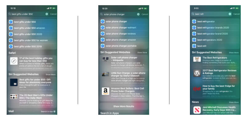 On iPhones, users can swipe right from the home screen to start a search. Apple typically presents Google results on top, which open in Safari as indicated by the Safari icons, followed by “Siri suggested websites” in many instances. These links send users directly to publisher sites and not through Google. (A “show more” link opens a full page of website results with branded icons.) There are also app-based results and other “local” content from the user’s phone (e.g., email).