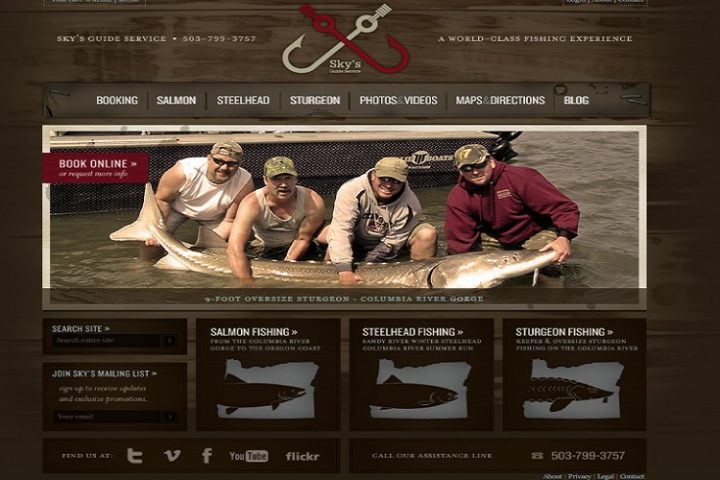 Sky’s Guide Service offers a feature at the bottom of their page that instructs visitors to “find us.” This works well because users will then recognize the icons for Twitter, Facebook, YouTube and Vimeo. They’ve also focused on social media their typical customer is likely to use. If you navigate to their blog, they’ve further integrated Facebook with the site by throwing up a feed of posts and inviting you to like their page.