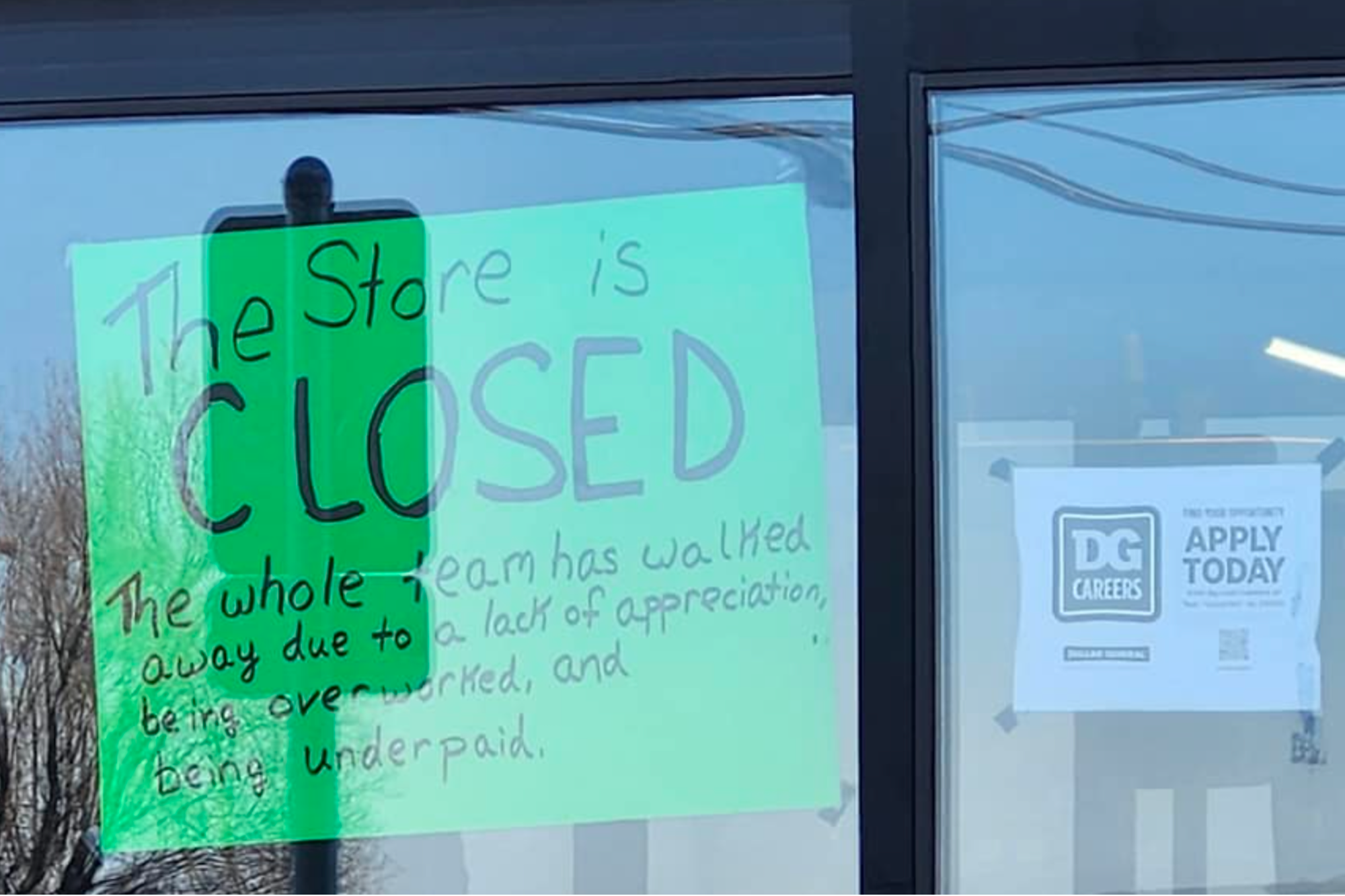 A Dollar General store in Wisconsin had to temporarily shut down after the entire staff quit last week due to a “lack of appreciation,” including low pay and an “immoral” food donation policy, per a note left on the door.