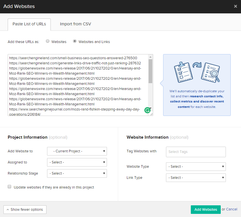 The next steps are really easy: Upload your list of URLs, then ensure you select “Websites and Links” because we want BuzzStream to retrieve the link data for us.