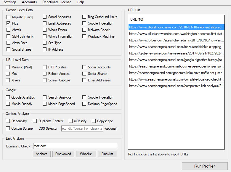 Then, take the list of URLs you’ve copied using Linkclump from the SERPs (I’ve just copied the top 10 from the news vertical for “moz.com” as my search), then paste the URLs in the list. You’ll need to select “Moz” in the Domain Level Data section (see screenshot) and also fill out the “Domain to Check” with your preferred URL string (I’ve put “Moz.com” to capture any links to secure, non-secure, alternative subdomains and deeper level URLs).