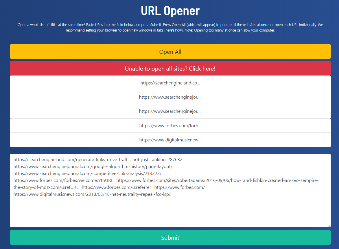 So from my list of URLs, I’ll copy the list and head over to URLopener.com (now bought by 10bestseo.com presumably because it’s such an awesome tool) and paste in my list before asking it to open all the URLs for me: