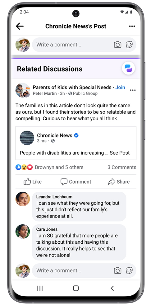 Some users may begin seeing Related Discussions in News Feed when someone posts a link or reshared a post on the social network, enabling them to see what other groups are saying about the same content.
