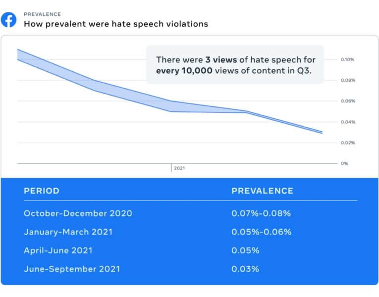 On Tuesday, Facebook published its Q3 2021 transparency reports, including reports on its most widely viewed content and community standards enforcement. The Widely Viewed Content Report shows a clear pattern in the top 20 most viewed posts and the Community Standards Enforcement Report shows that the prevalence of hate speech on Facebook has decreased for the fourth consecutive quarter.