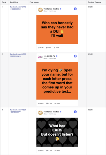 That having been said, the top 20 posts all contained a background or image with text and seem to be designed to solicit reactions from users. They also seem to lend themselves to short comments and tagging other users. Notably, eight of the top 20 posts were from a page called Thinkarete lifestyle.