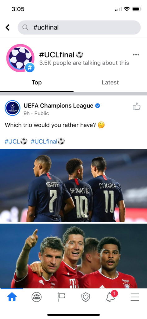 Fans who search for or click on the #UCLFinal hashtag on Facebook will be taken to the UEFA Champions League hub, featuring a feed of some of the most popular related content on the platform, including posts from UEFA, the two clubs vying for the trophy and media outlets covering the match.
