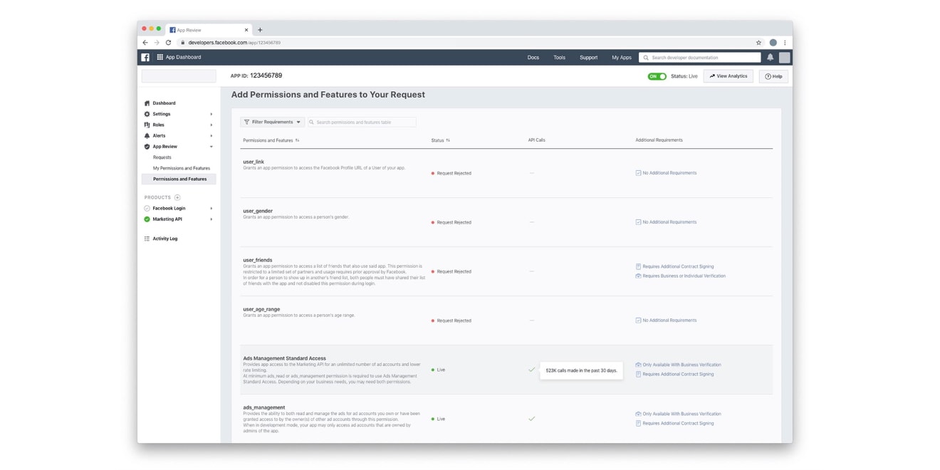 The social network sends messages to developers—via the dashboard inbox or personal email—related to the permissions they requested, which can become an onerous process if that number is too high.
