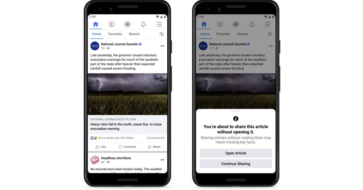 Starting today, we’re testing a way to promote more informed sharing of news articles. If you go to share a news article link you haven’t opened, we’ll show a prompt encouraging you to open it and read it, before sharing it with others. pic.twitter.com/brlMnlg6Qg