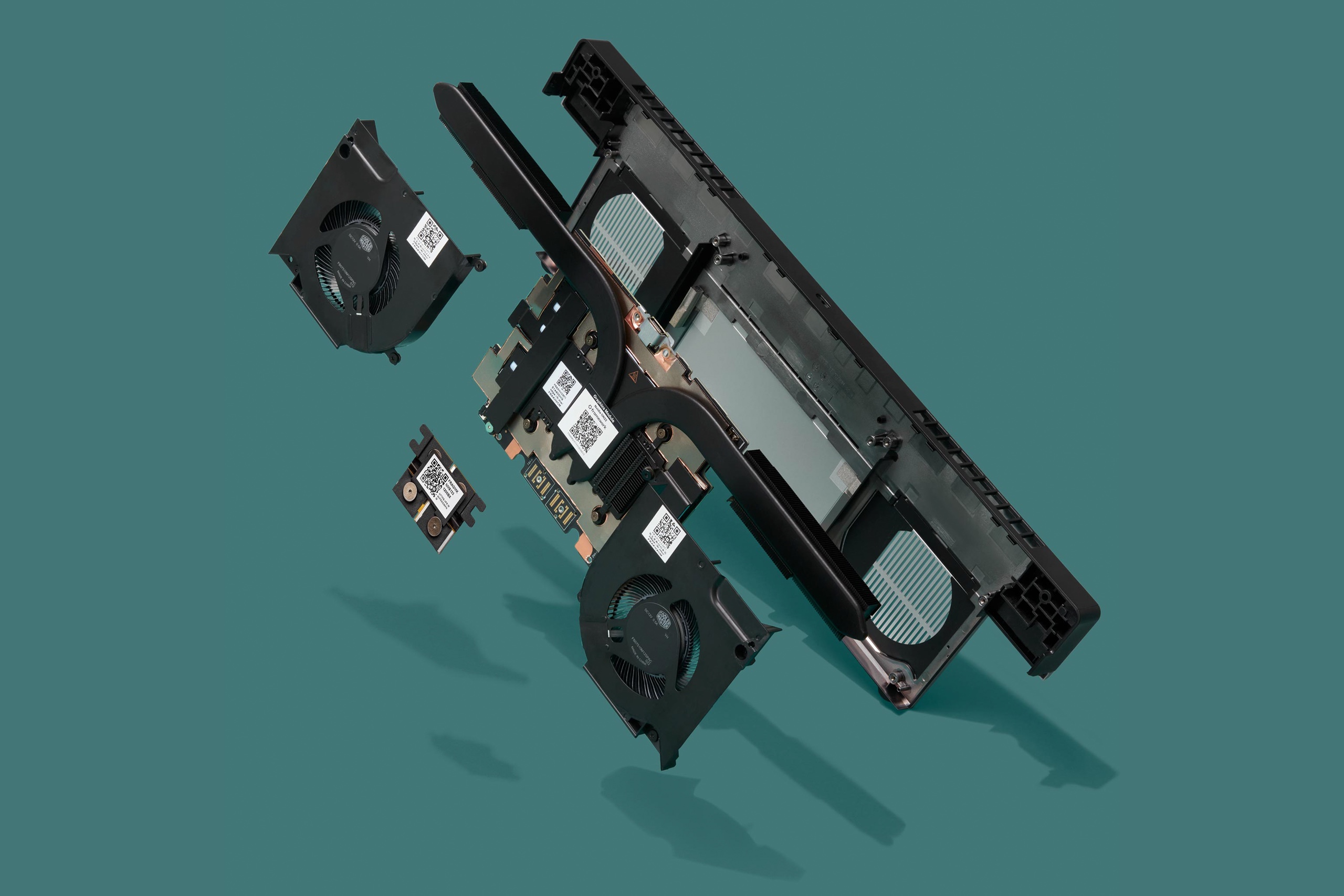 The Laptop 16’s new graphics module and cooling system, also exploded. Credit: Framework