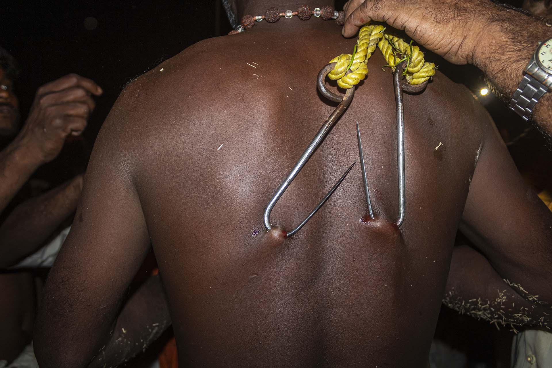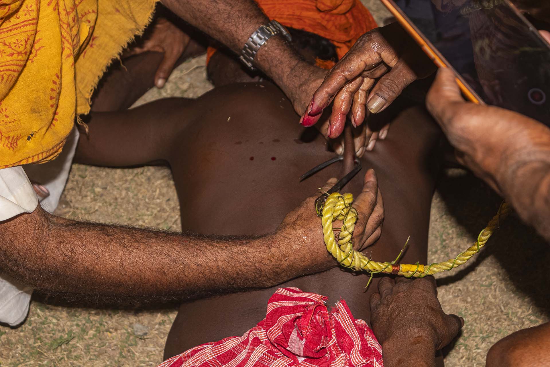 Gajan is a Hindu festival celebrated mostly in the Indian state of West Bengal. It is associated with such deities as Shiva, Neel and Dharmaraj. Gajan spans around a week, starting at the last week of Choitro continuing till the end of the Bengali year. It ends with Charak Puja. Participants of this festival is known as sannyasi or Bhokto. Persons of any gender can be a participant. The complete history of the festival is not known. The central theme of this festival is deriving satisfaction through non-sexual pain, devotion and sacrificeThe word gajan in Bengali comes from the word garjan or roar that sannyasis (hermits) emit during the festivities. Alternatively, the word gajan is considered a combination of parts of two words – ga is from the word gram meaning village and jan is from the word janasadharan meaning folk. In this sense gajan is a festival of village folk.