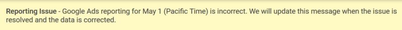Current status: Data through April 30 is now corrected. Google says it is still working on correcting reporting from 12:01am on May 1 to 4:00am May 2 (PDT).