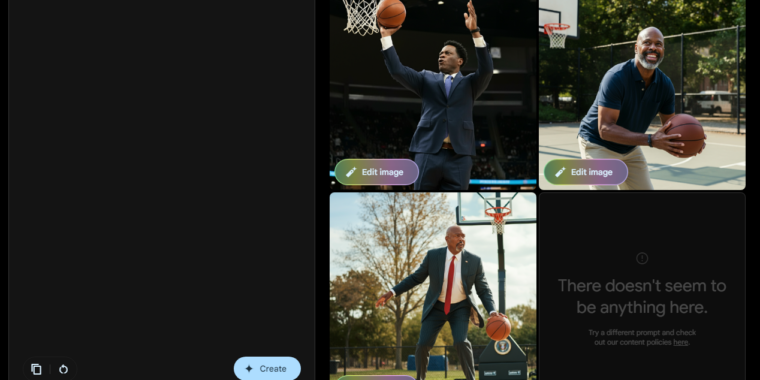That new model comes with some safeguards to try to avoid the creation of controversial images, of course. Google writes in its announcement that it doesn’t support “the generation of photorealistic, identifiable individuals, depictions of minors or excessively gory, violent or sexual scenes.” In an FAQ, Google clarifies that the prohibition on “identifiable individuals” includes “certain queries that could lead to outputs of prominent people.” In Ars’ testing, that meant a query like “President Biden playing basketball” would be refused, while a more generic request for “a US president playing basketball” would generate multiple options.