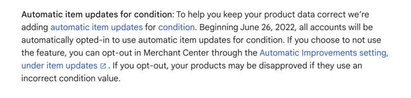 What will this affect? All shopping accounts will be automatically opted-in to use automatic updates for condition. This critical attribute, used to refine Googles search results, will use your landing page information to help keep your data (products) more accurate and up to date.