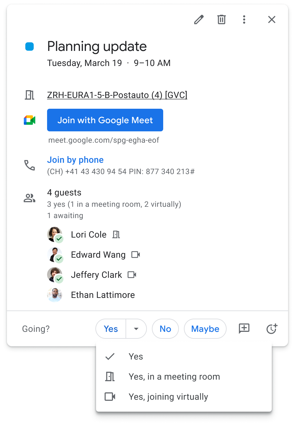 Virtual attendees will specify their status through a new drop-down menu that is viewable by the host and other guests in the event details. The company hopes that listing how people plan to attend an event will help organizers know what to expect, and presumably accommodate attendees who won’t physically be in the room. While the new options are currently limited to invites in Calendar, Google plans to bring them to invites that appear in Gmail in the future as well.
