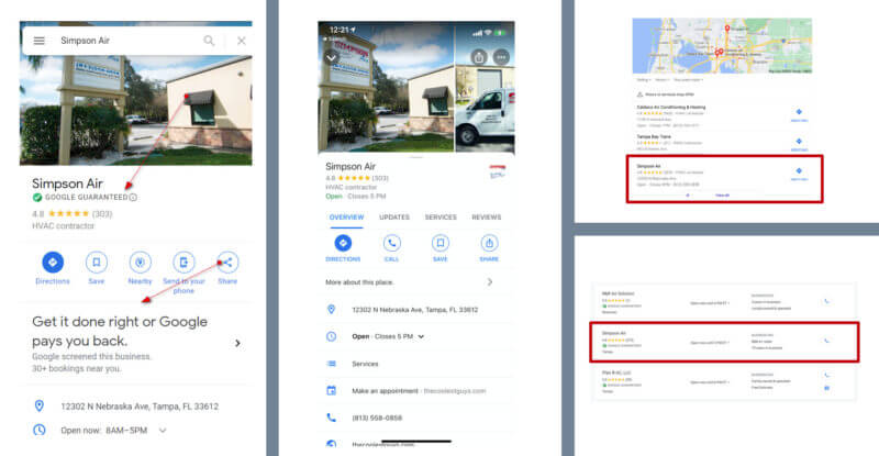 In the graphic above, Simpson Air is an LSA advertiser. On one version of their Google Maps local profile the Google Guaranteed badge appears but in other places it does not. The company does not rank in the top three LSAs for the query “HVAC in Tampa Florida.” It’s buried on a secondary “more pros” page of LSA advertisers that is likely to receive few if any impressions, let alone contacts. (Cue the joke about the best place to hide a dead body.)