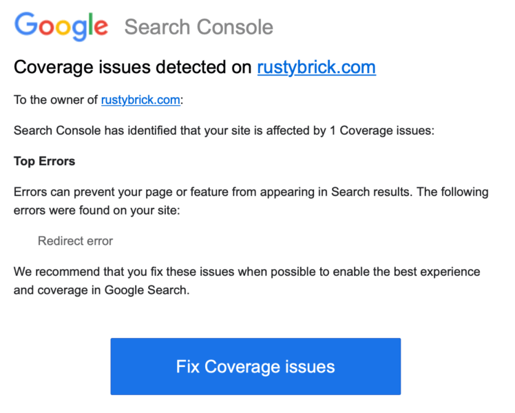The email. Here is a sample of what the email looks like. It reads, “Coverage issues detected on domain. Search Console has identified that your site is affected by 1 Coverage issues: Top Errors. Errors can prevent your page or feature from appearing in Search results. The following errors were found on your site: Redirect error. We recommend that you fix these issues when possible to enable the best experience and coverage in Google Search.”