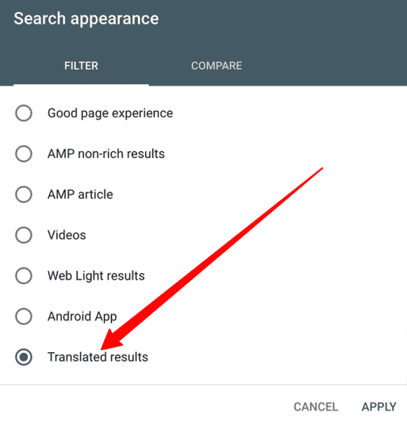 How to access this filter. You can access this filter by logging into Google Search Console, clicking on your performance report and then clicking on the “+new” filter and selecting the search appearance for “translated results.” Here is a screenshot of how to access the filter:
